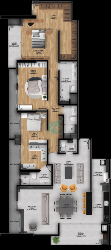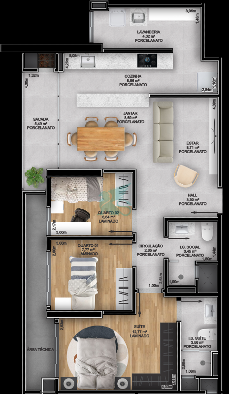 01 Suíte + 02 quartos, varanda gourmet integrada a sala de jantar e cozinha, banheiro social e área de serviço. Depósito individual no andar do apartamento